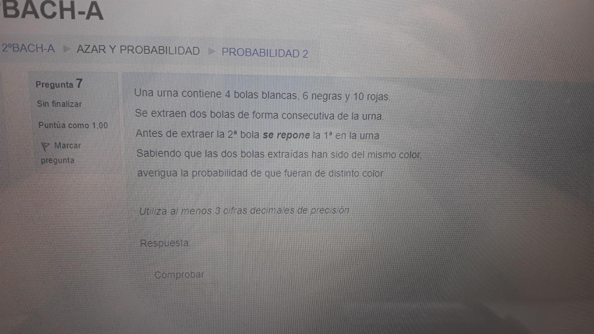 Una urna contiene 4 bolas blancas, 6 negras y 10 rojas. Se extraen dos bolas de forma consecutiva de la urna. Antes de extraer la segunda bola SE REPONE la primera en la urna. Sabiendo que dos bolas extraídas han sido del mismo color,averigua la probabilidad de que fueran de distinto color.
