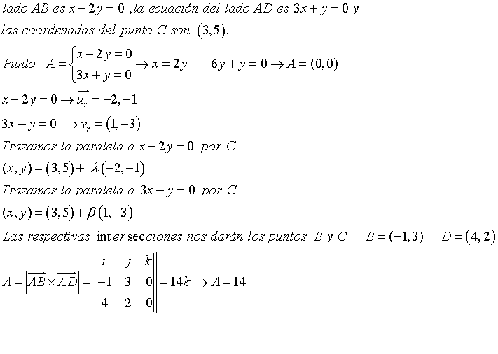 Debes, ahora, hallar los dos véctores que determinan el paralelogramo, por ejemplo el AB y el AC y luego hallar el módulo del vector que resulta de multiplicar ambos vectorialmente.