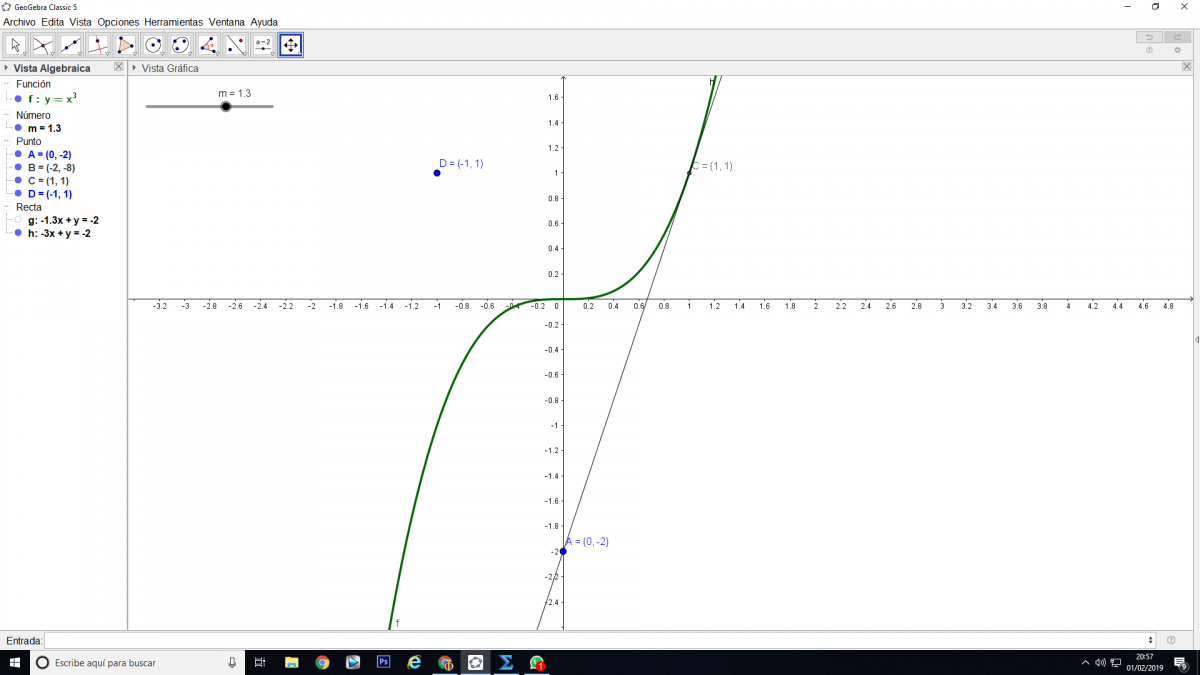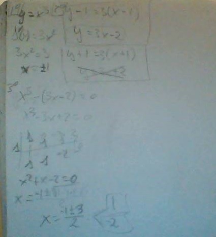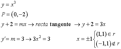 Se ha trazado una recta tangente a la curva y= x3, cuya pendiente es 3 y pasa por el punto (0,−2). Hallar el punto de tangencia.