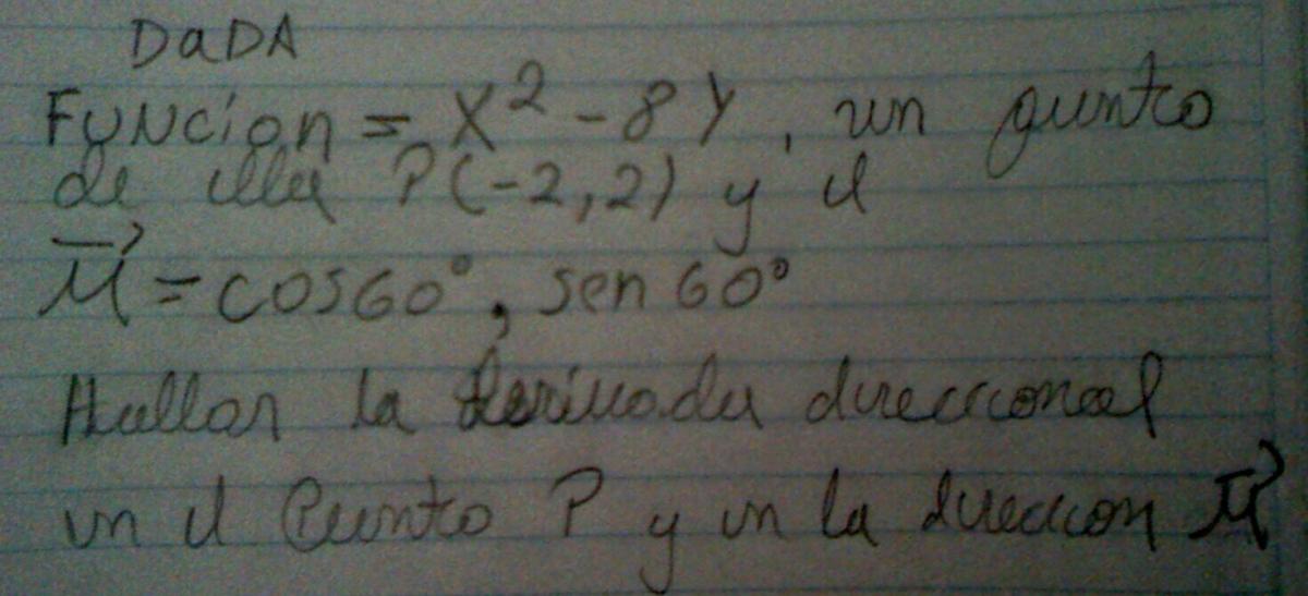 Hola amigos , soy nueva en el grupo , les agradecería que me ayudaran a hallar la derivada direccional del punto p y en !a dirección hay marcada , lo único que se es que la función me quedaría 2x-8y creo ,que es hacii y si saco coseno de 60 me da 1/2 y seno de 60 √3/2 pero no se si sea necesario hacerlo o hay una formula en la tabla de derivadas que me lleven al resultado que hay me piden ... Este tema se llama derivadas direccionales o tasa de variación