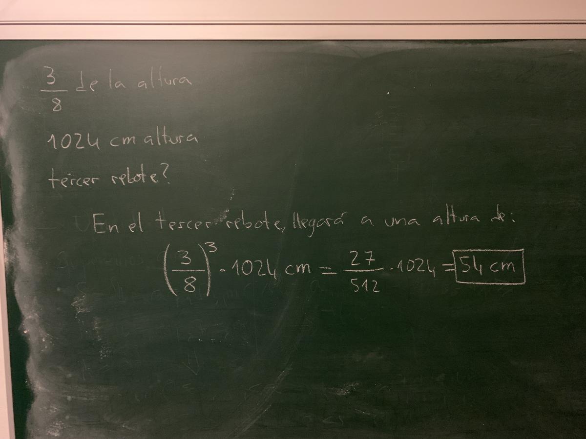 Una pelota ,al caer al suelo rebota hasta 3/8 de la altura desde la que se suelta .si se la deja caer al suelo desde 1024 cm , ¿ a que altura llegara tras el tercer bote?