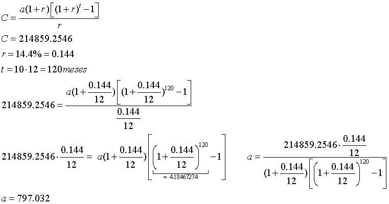 Ricardo depositó la misma suma de dinero en el banco todos los meses durante 10 años a una tasa anual de 14,4%. Si los intereses se acumulan en forma mensual y al finalizar el último mes del 10° año Ricardo retiró $214.859,2546 del banco, ¿Cuál es la suma fija que depositaba todos los meses en el banco?