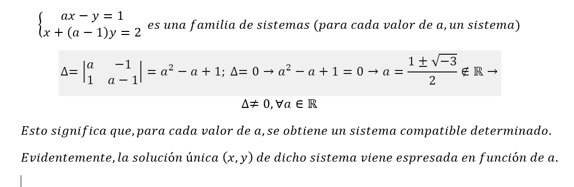 Hola Unicoos, hoy me han dado un examen que hice la semana pasada. Uno de los ejercicios pedia estudiar un sistema (rango, soluciones, etc..). El rango (2) coincidia con las incognitas ( x e y) pero las soluciones de ambas incognitas dependian del parámetro "a" (el cual corresponde a los reales). Mi pregunta es: ¿aunque las soluciones dependan de un parámetro cuyo valor puede variar de menos infinito a mas infinito, al tratarse de un sistema compatible determinado, no puedo afirmar que tiene infinitas soluciones?