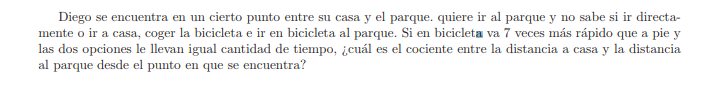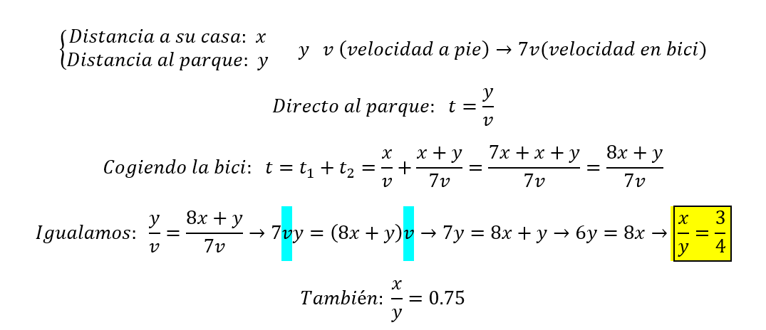 y el tiempo que tardaría en regresar a casa a pié más en ir al parque en bici es t=x/v + (x+y)/7v