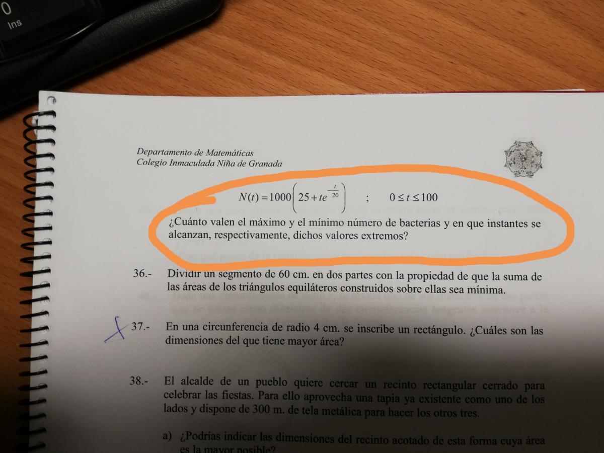 Hola buenas noches. Este ejercicio que os voy a mostrar el procedimiento sé hacerlo pero no sé hacer la derivada. La función es: N(t)=1000(25+te^(-t/20)).