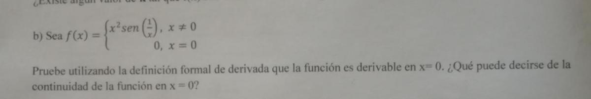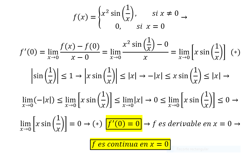 f ' (0) = Lím(h→0) (1/h)*( h2*sen(1/h) - 0 ) = Lím(h→0) (1/h)*h2*sen(1/h) = Lím(h→0) h*sen(1/h) = 0 (1).