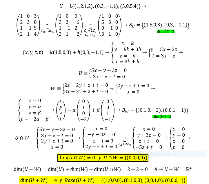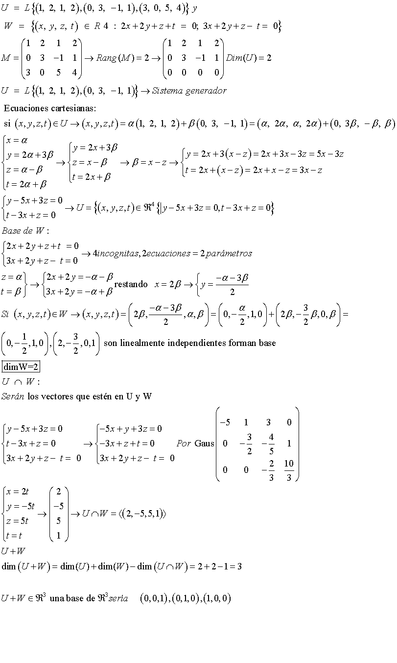 Sean U = L({(1, 2, 1, 2),(0, 3, −1, 1),(3, 0, 5, 4)} y W = {(x, y, z, t) ∈