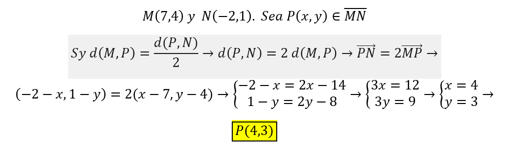 Luego, tienes en tu enunciado la relación entre las distancias determinadas por un punto genérico: P(x,y) perteneciente al segmento MN, y los puntos extremos del segmento: