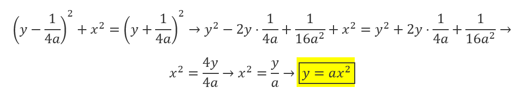 Me piden que demuestre que la funcion y= ax^2 es una parabola.. y al final queda esta formula, y me dice que desarrole los cuadrados, simplifique y que teniendo en cuenta que y= ax^2 , entonces lo q se quiere lograr es que quede que ambas son iguales. pero no se como hacerlo. ahi le dejo las fotos asi pueden desarrollar.![]()
