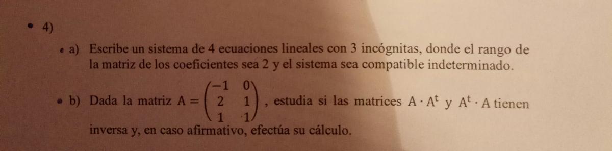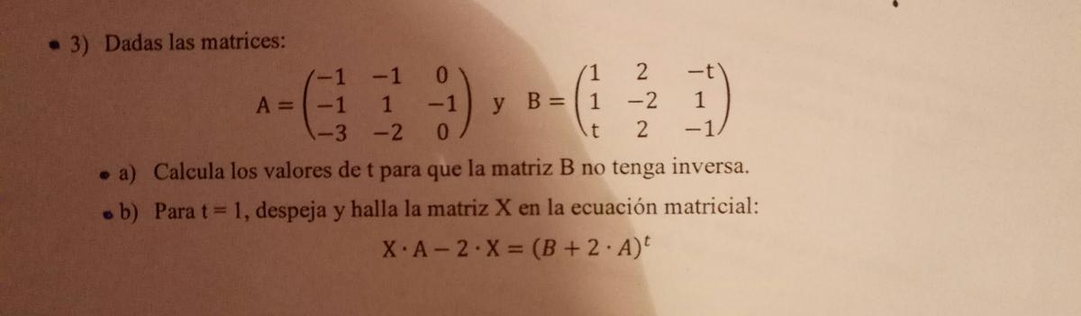 Una matriz no tiene inversa si su determinante es 0. Haz el determinante de B e igualalo a 0, para obtener el valor de t.