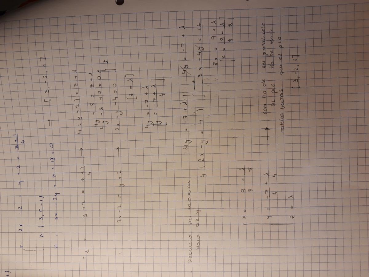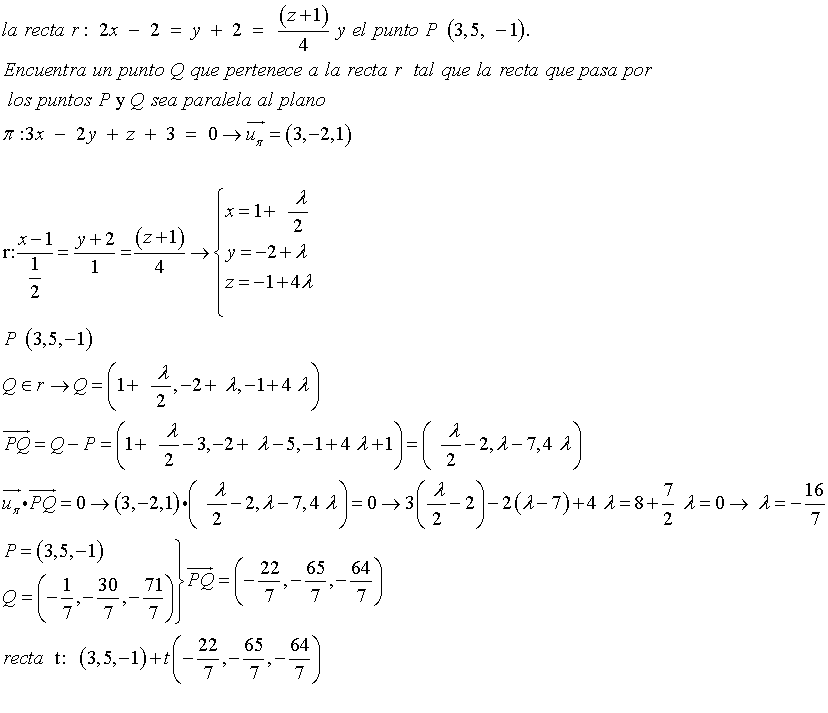 Consuderamos la recta r: 2x - 2 = y + 2 = (z+1)/ 4 y el punto P (3,5, -1). Encuentra un punto Q que pertenece a la recta r con tal que la recta que pasa por los puntos P i Q sea paralela al plano π: 3x - 2y + z + 3 = 0