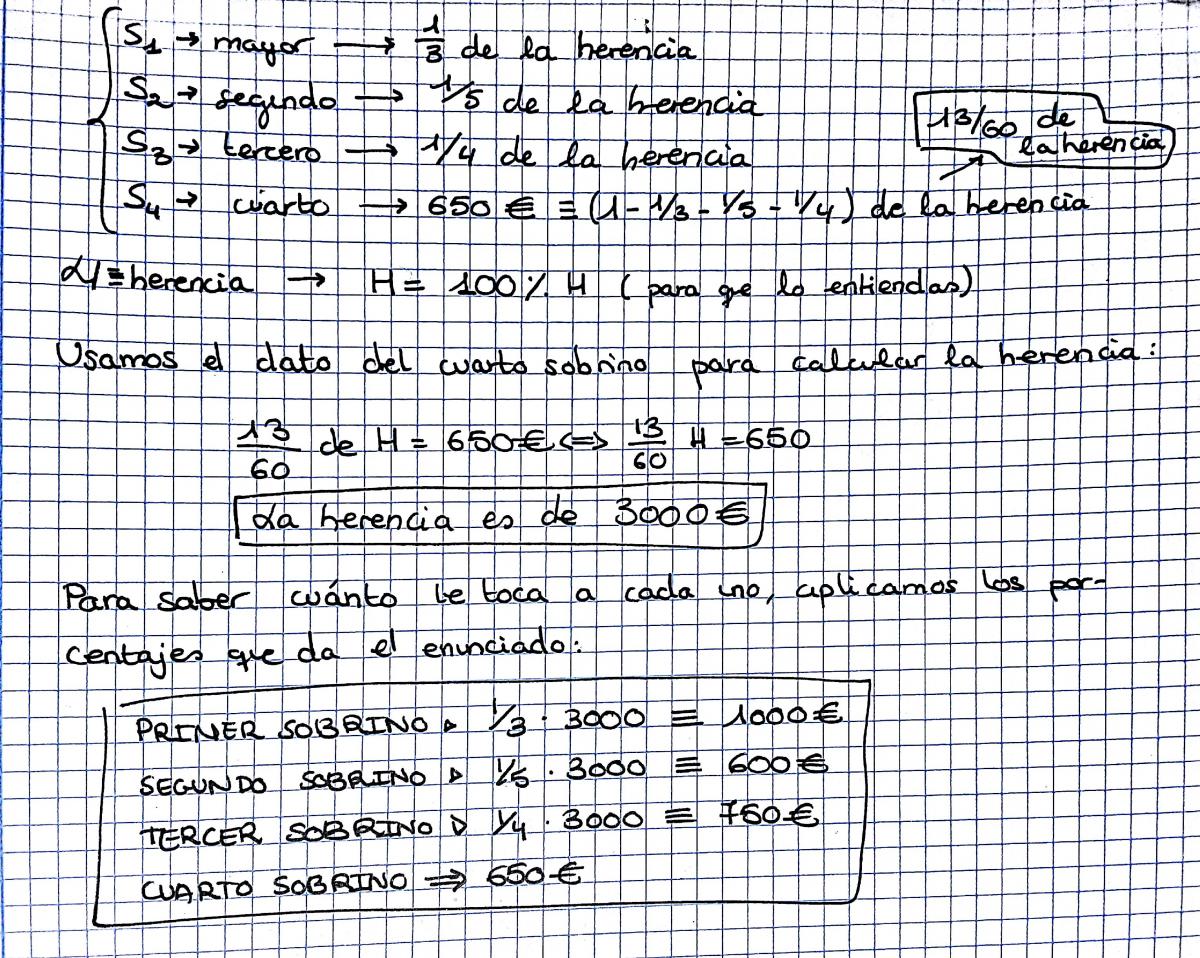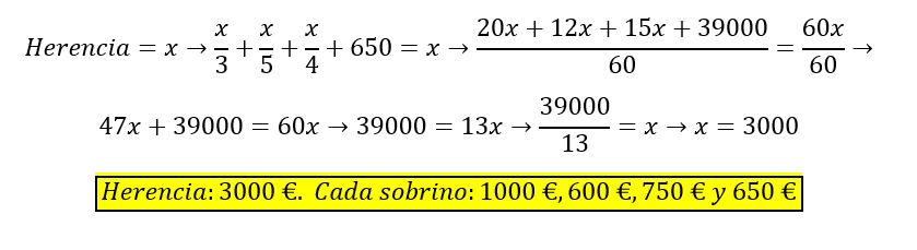 Tengo un problema que se me resiste; .Un hombre deja una herencia a repetir entre sus cuatro sobrinos. El mayor se lleva la tercera parte, el segundo la quinta parte,el tercero la cuarta parte y el cuarto 650€ ¿ De cuánto es la herencia? ¿Cuánto toca a cada uno?
