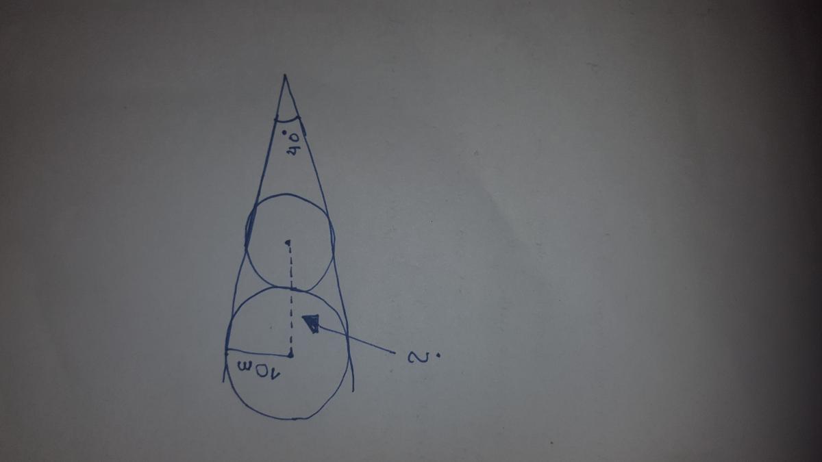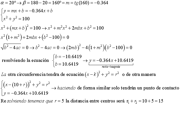 Dos circunferencias son tangentes entre si.La mayor tiene un radio de 10 metros.Las rectas tangentes comunes a las dos circunferencia forman un ángulo de 40 grados.Calcula la distanciaque hay desde el centro de la circunferencia mayor al centro de la menor.