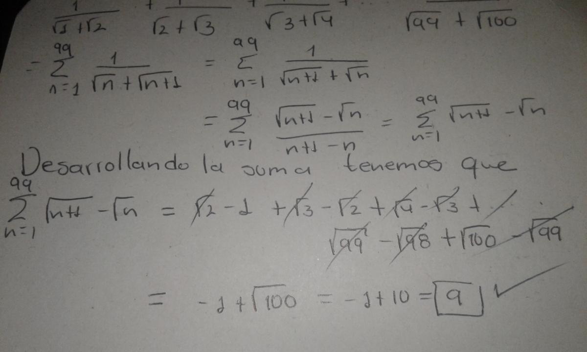 y así siguiendo, hasta evaluar la última suma parcial, cuya expresión surge para evaluar para n = 99, que es el número de orden del último término general evaluado que tienes en la suma de tu enunciado, cuya expresión es: √(100)-√(99).