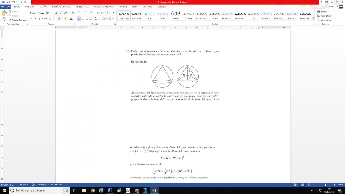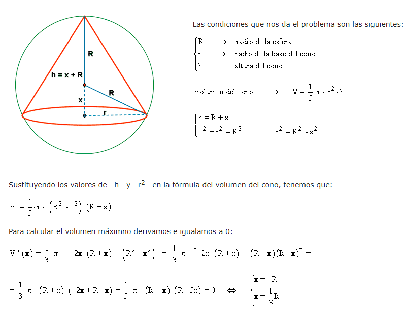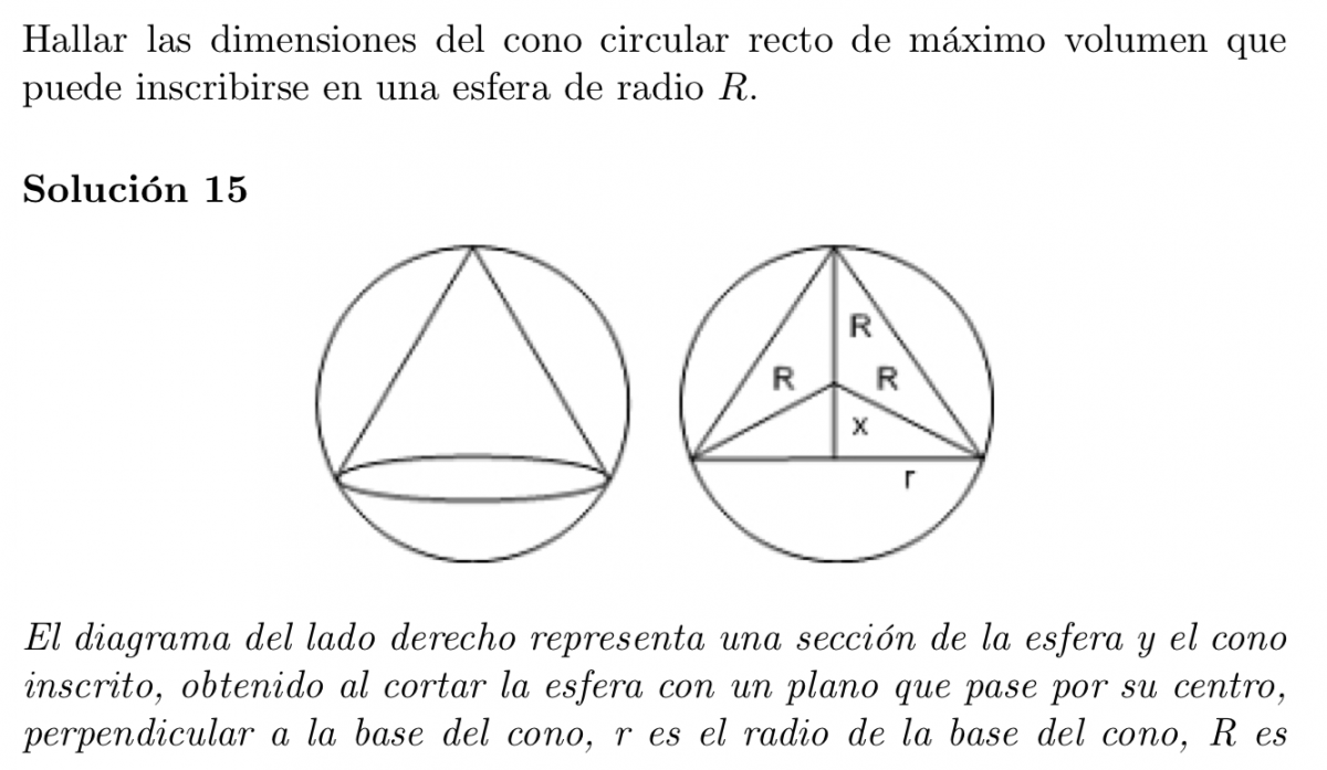 Buenas noches, podrían ayudarme con este ejercicio de optimización? Hallar las dimensiones del cono recto circular de máximo volumen que puede ser inscrito en una esfera de radio "a"