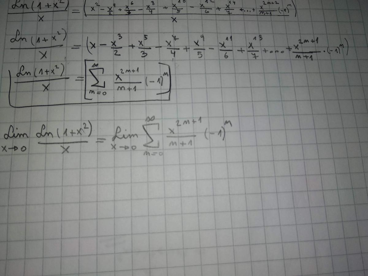 ln(1+x2) / x = ∑(n=0,∞) (-1)n*x2n+2/(n+1)! / x = ∑(n=0,∞) (-1)n*(x2n+2/x)/(n+1)! = ∑(n=0,∞) (-1)n*x2n+1/(n+1)!.
