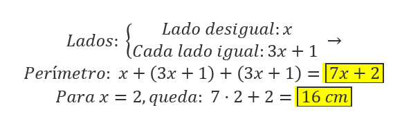 Expresa mediante un binomio el perímetro de un triangulo isosceles cuyos lados iguales superan en 1 cm al triple del lado desigual. Calcula su valor si el lado desigual mide 2 cm