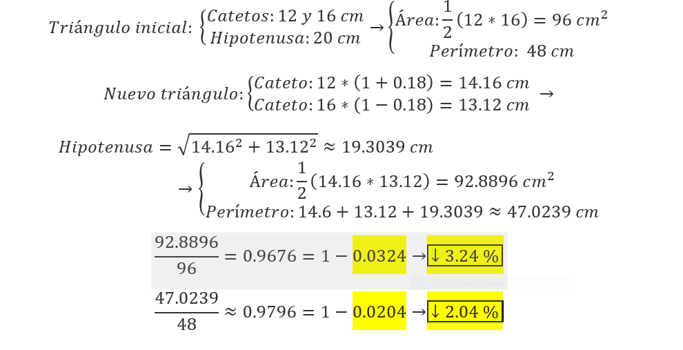 respectivamente, 12, 16 y 20 (cm). Si el cateto menor experimenta un aumento del 18% y el