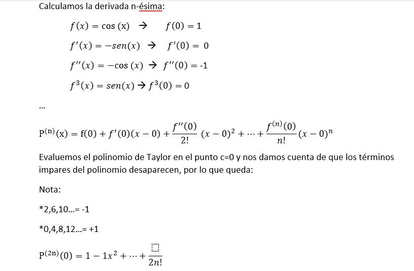 Perdón por molestaros otra vez con la relación de n, para el polinomio de taylor de orden n, pero es que me he dado cuenta que los términos impares desaparecen, pero la cuestión es que si empiezas desde 0 y le vas sumando 4 el resultado de la derivada sucesiva en 0 es +1, pero si empiezas por el 2 y le vas sumando cuatro el resultado de la derivada sucesiva en 0 es -1. No tengo mucha idea de como ponerlo.