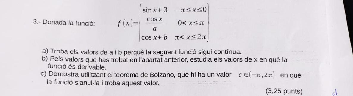 c) Demuestra utilizando el teorema de Bolzano, que ay un valor c ∈(-π, 2π) en que la función se anule. Encuentra el valor.