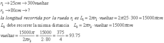 Dos ruedas están unidas por una banda transmisora, la primera rueda tiene un radio de 25 cm, y la segunda de 80 cm, cuando la primera rueda ha dado 300 vueltas, ¿Cuántas vueltas habrá dado la segunda?