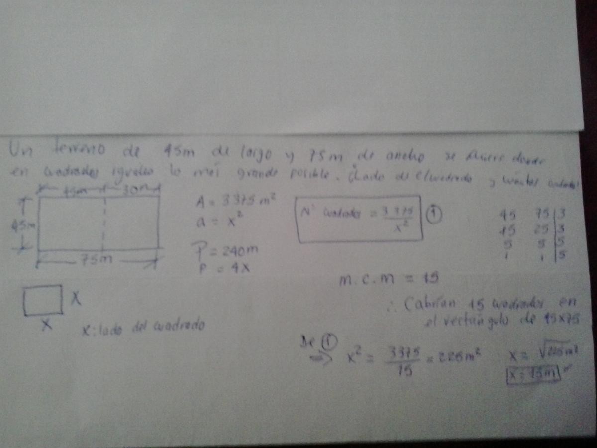 Como el tema es aplicación de ecuaciones cuadráticas, lo he intentado y no me sale; en la foto sacqué el m.c.m para intentarlo, pero cómo puedo plantear la ecuación cuadrática?, tengo que considerar el perímetro?, esas son mis dudas. Les anexo la foto ( la resolució de la foto no es buena, perdón) de lo que conseguí hacer. Me sale como resultado 15 m de lado y 15 cuadrados.