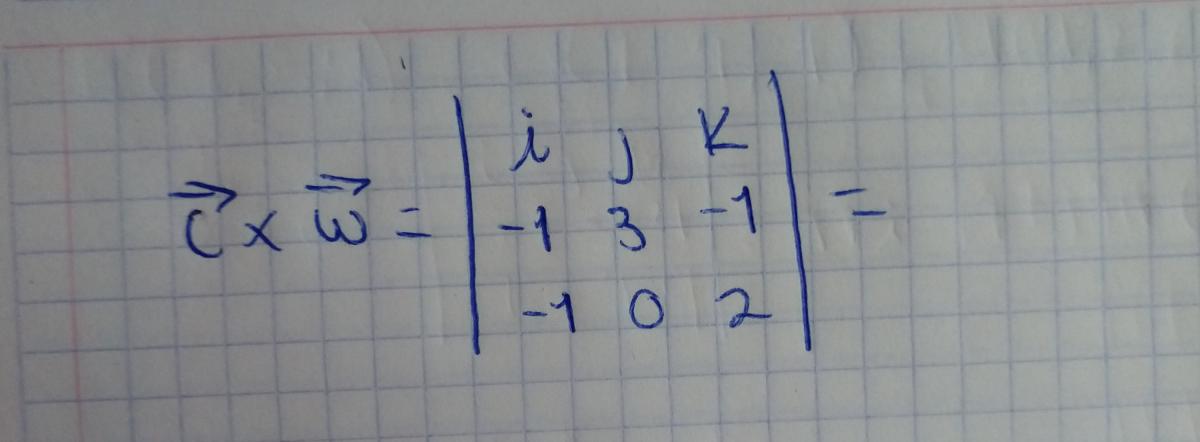 p = c x w = <-1,3,-1> x <-1,0,2> = <6,3,3>, cuyo módulo es: |p| = √(54) = 3√(6).