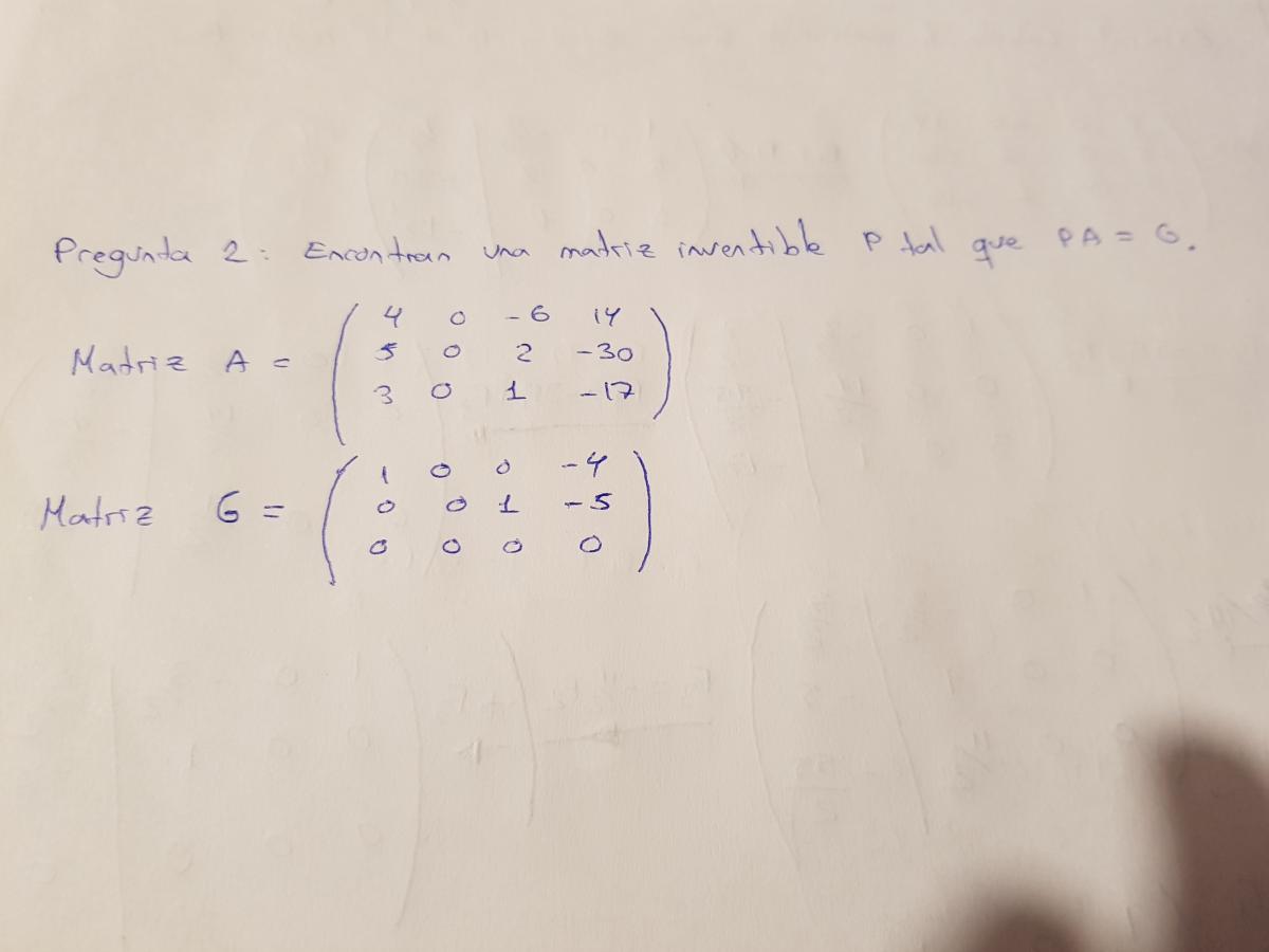 Hola Unicoos. Necesito ayuda para encontrar la matriz inbertible de P sabiendo que me dan la matriz A y ya he calculado la matriz de Gauss-Jordan de A. Sería agradable si me lo pudiesen indicar por pasos. Muchísimas gracias de nuevo