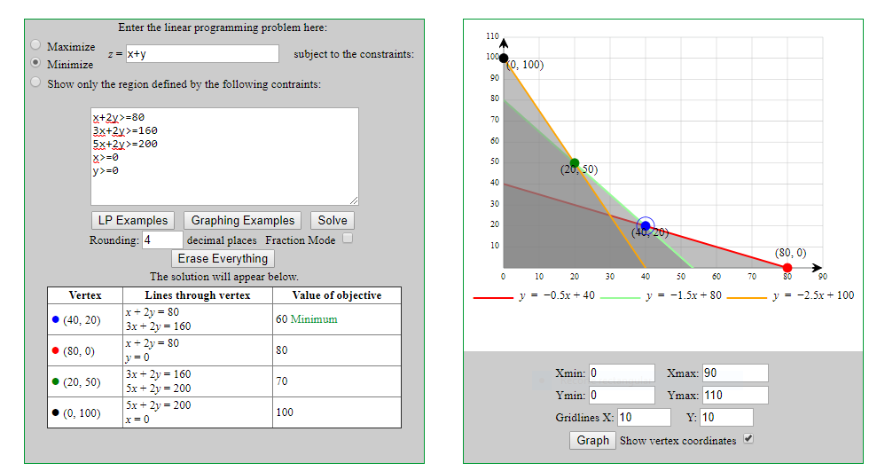 restricciones: x + 2y ≥ 80 ; 3x + 2y ≥ 160 ; 5x + 2y ≥ 200 ; x ≥ 0 ; y ≥ 0.