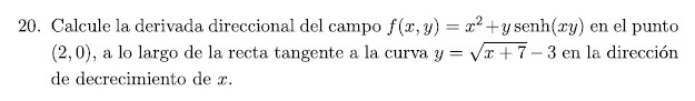 Luego, como tienes que calculara la derivada direccional de una función que es diferenciable en el punto en estudio,evalúas la expresión de su vector gradiente para dicho punto: ∇f(2,0), y la expresión de la derivada direccional queda:
