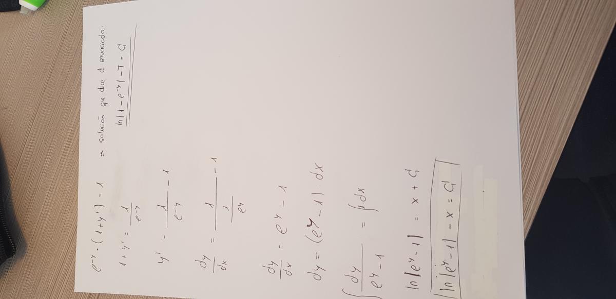 = -ln(ey) + ln(ey-1) + C1, resuelves el primer término, y queda: