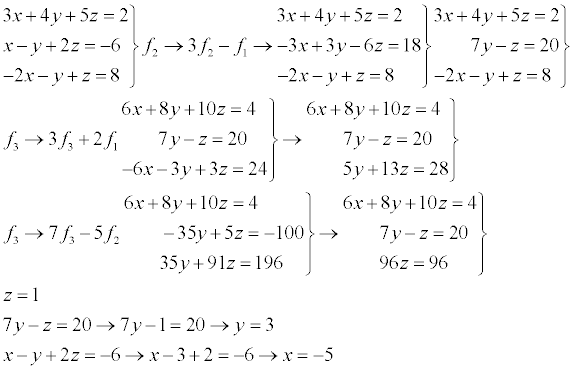 a la segunda fila le restas el triple de la primera, a la tercera fila le sumas el doble de la primera, y queda: