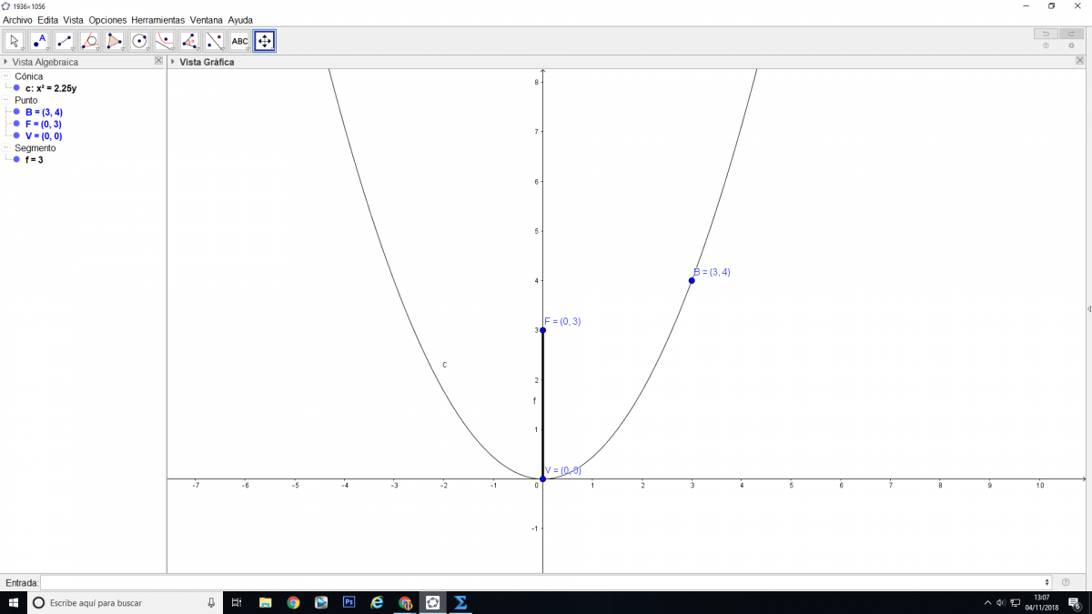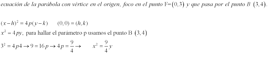 Escribe la ecuación de la parábola con vértice en el origen, foco en el punto A (0,3) y que pasa por el punto B (3,4).