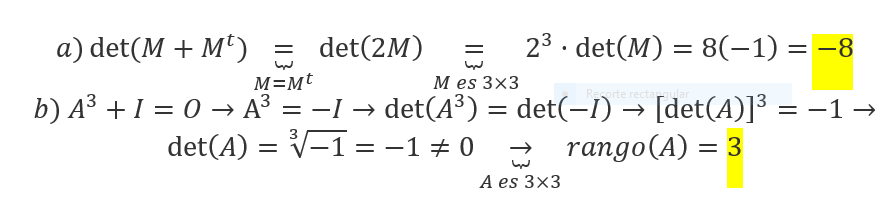 a) Sea M una matriz simétrica de orden 3 con det igual a -1. Calcule el det de (M+Mtraspuesta).
