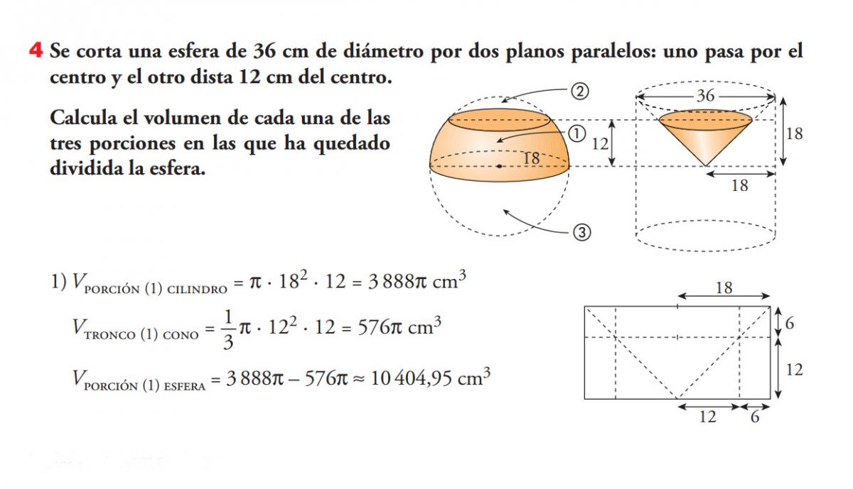 Se corta una esfera de 50 cm de diámetro por dos planos paralelos a 8 cm y 15 cm del centro respectivamente .halla el volumen de la porción de la esfera comprendida entre ambos planos.