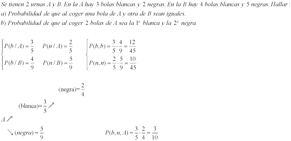 Se tienen 2 urnas A y B. En la A hay 3 bolas blancas y 2 negras. En la B hay 4 bolas blancas y 5 negras. Hallar: