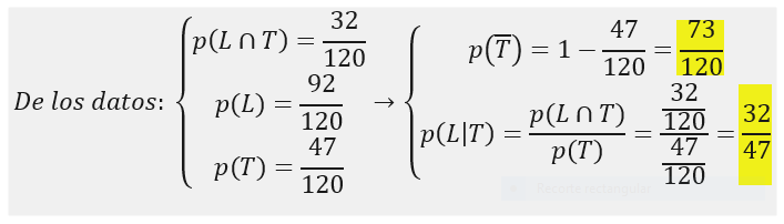 les gusta leer y ver la televisión. Los resultados son: - A 32 personas les gusta leer y ver la tele. - A 92 personas les gusta leer. - A 47 personas les gusta ver la tele. Si elegimos al azar una de esas personas: a) ¿Cuál es la probabilidad de que no le guste ver la tele? b) ¿Cuál es la probabilidad de que le guste leer, sabiendo que legusta ver la tele? muchas gracias
