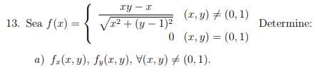 Observa que debes plantear la expresión de las derivadas parciales para puntos distintos de (0,1), por lo que debes derivar la expresión del trozo superior, por lo que puedes hacerlo con reglas de derivación (observa que debes emplear la regla de la división, y la regla de la cadena al momento de derivar la expresión del denominador), y queda: