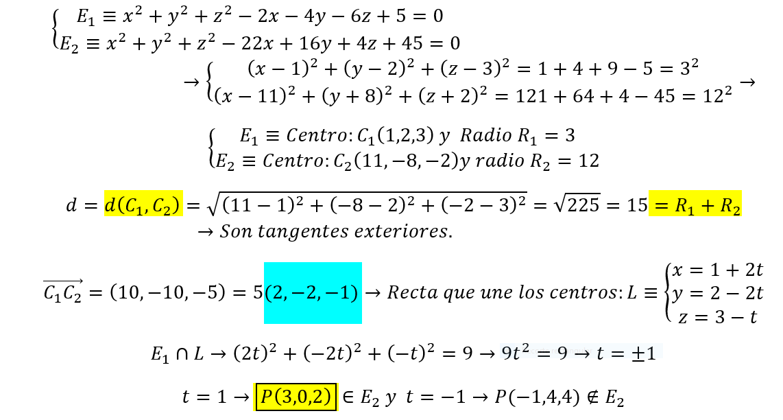 El problema que se me presenta es al momento de hallar el punto de tangencia ya que me da un punto del cual no estoy seguro que sea correcto porque hice la gráfica de las dos esferas en Geogebra y el punto que me daba