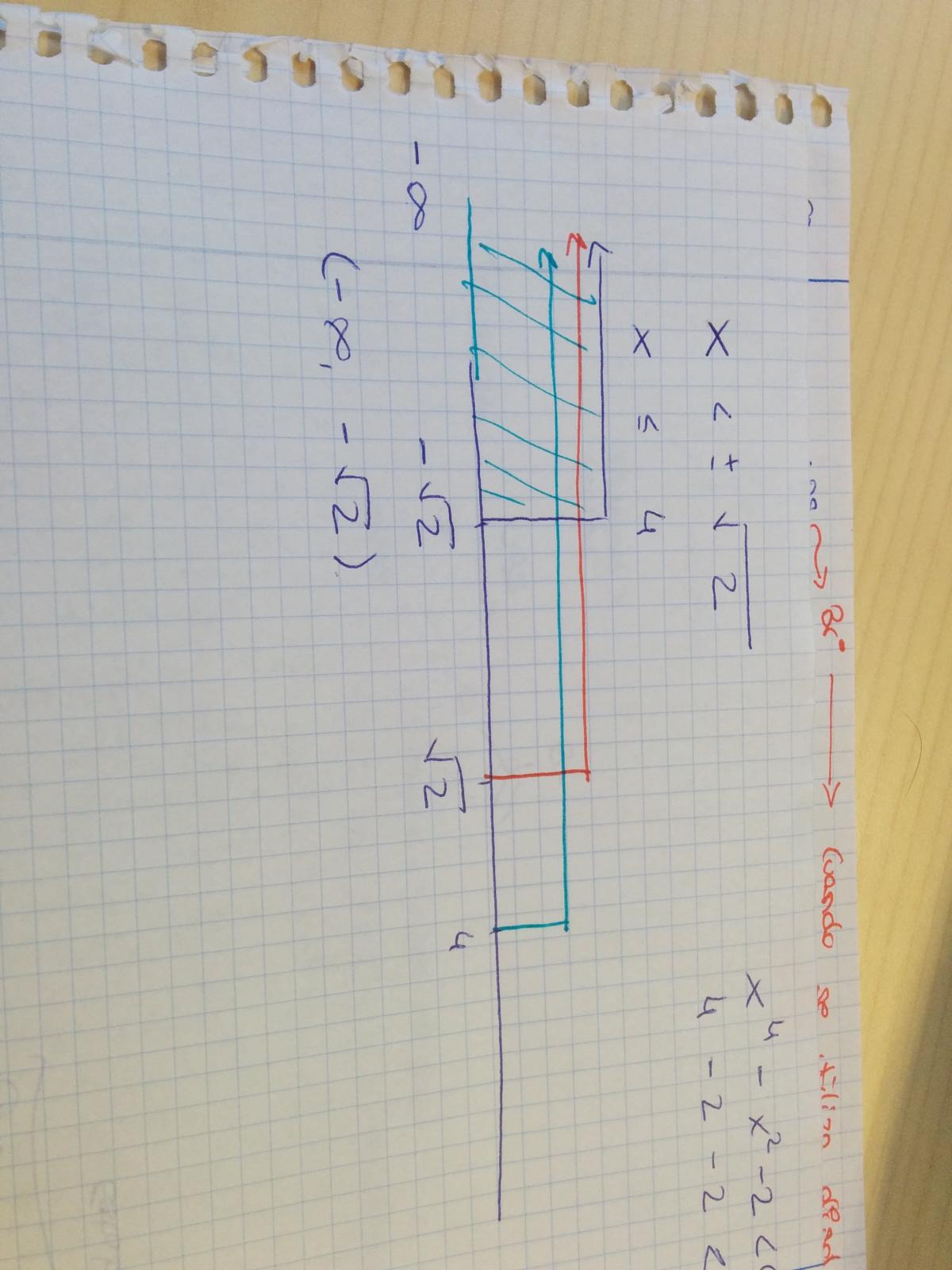 A partir de aquí no se seguir. Ya había preguntado antes y me dieron la solución que era que x estaba entre menos raíz de dos y raíz de dos. Yo creía que el intervalo era desde menos infinito hasta menos raíz de dos.