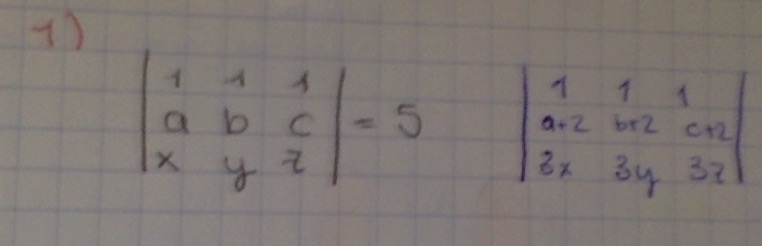 Luego, observa que el determinante del primer término es igual a 5 según tienes en tu enunciado, y observa también que el determinante del segundo término es igual a cero porque tiene dos filas iguales, por lo que reemplazas valores, y queda: