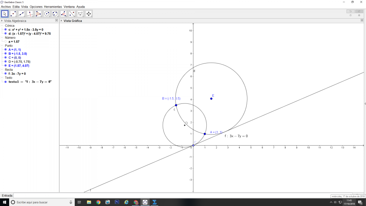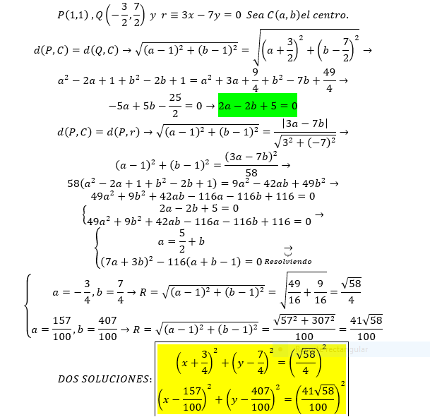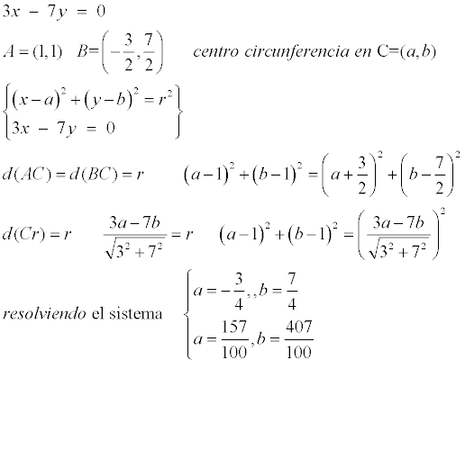 Buenas noches, podrian ayudarme a resolver este ejercicio? Hallar la ecuación de la circunferencia que pasa por los puntos (1,1) y (-3/2,7/2) y que sea tangente a la recta 3x - 7y = 0