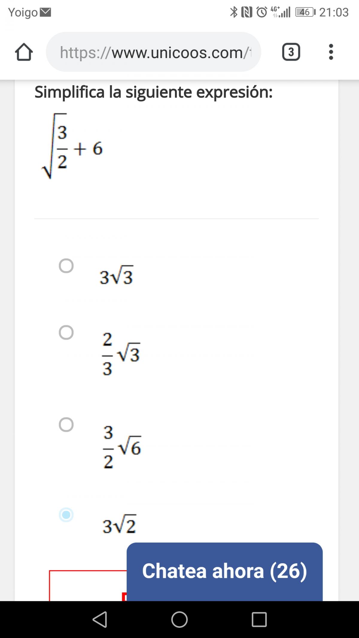 2. Simplificar √ (3/2) + 6. Al parecer la solución es 3/2 (√6) pero no llego a ella, cualquier cosa que obtengo es más complicado que el propio enunciado ¿Alguien podría resolverlo para ver dónde me estoy equivocando?