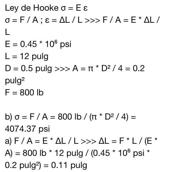 b) σ = P/A = 2118.035 lbf / 0.04908 in² = 43154.74 Psi = 43.15 KPsi.