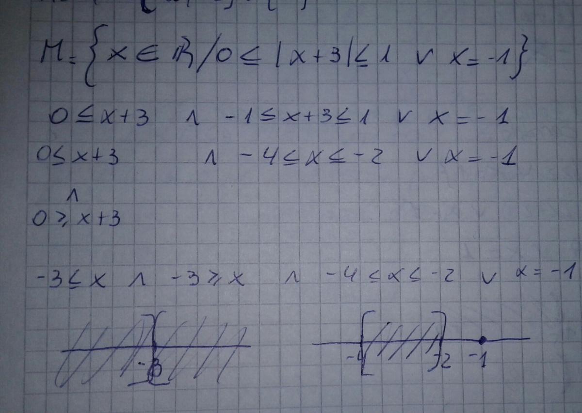 Observa que en la definición del conjunto M tienes una disyunción (∨), y que resulta Verdadera si al menos una de las proposiciones es verdadera.