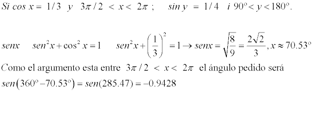 Si cos x= 1/3   y   3π/2 < x< 2π ;      sin y = 1/4    i 90º<y<180º.    Calculad: