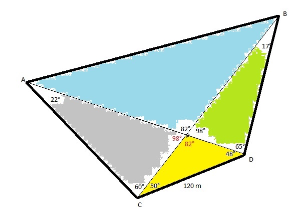 sen(48°)/CP = sen(82°)/CD, de aquí despejas: CP = sen(48°)*CD / sen(82°), reemplazas valores, resuelves, y queda: CP ≅ 90,054 m (1);