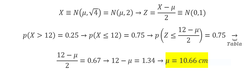 Si el largo de unos pernos es una variable aleatoria X que sigue un modelo normal de media 11 cms. Y una varianza de 4cms^2. El fabricante separa los pernos en tres categorias: A, B Y C, en donde C es mayor a 12 cm. Si se mantiene la varianza ¿cuanto valdrá la longitud media si la categoría C de los pernos constituyen el 25 % de la producción total?