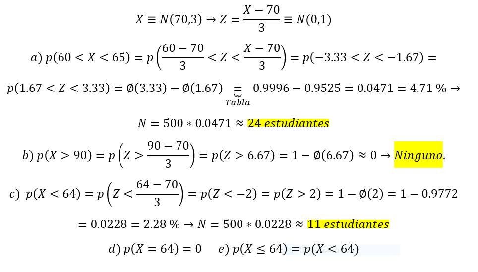 La media de los pesos de 500 estudiantes de un colegio es 70 kg y la desviación típica es 3 kg. Suponiendo que los pesos se distribuyen normalmente, hallar cuantos estudiantes pesan: