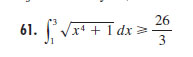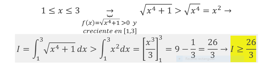 Observa que la expresión x4 + 1 toma valores mayores o iguales que 2 en el intervalo de integración [1,3], y observa que si a esta expresión le restas 1, obtienes otra expresión que es menor que ella y que tomas valores mayores o iguales que 1 en el intervalo de integración mencionado, por lo que tienes: